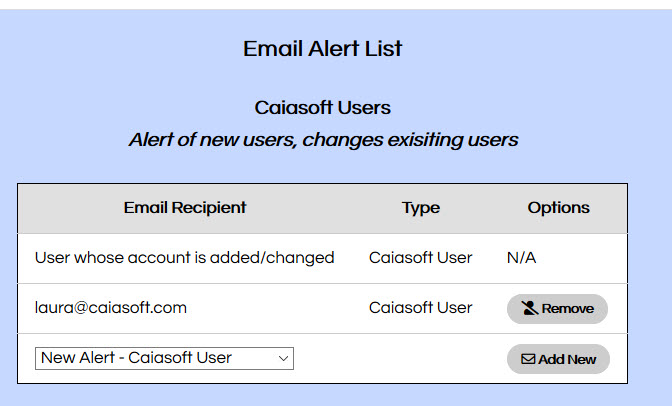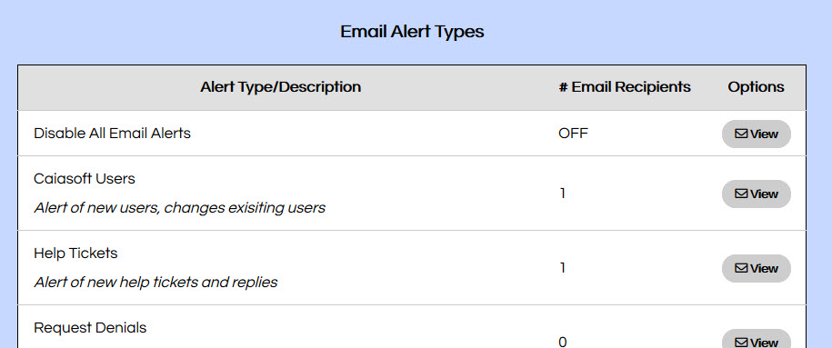 Emails that are triggered automatically from functions within the Caiasoft system are now listed in a central location. See the Email Alerts button in the Administration Module for a list of all emails going out and the recipient list for each. If your facility was utilizing the email field on the Circulation Stops/Location pages and had notify of denied requests turned on, it has already been moved over to this area and requires no action on your part.