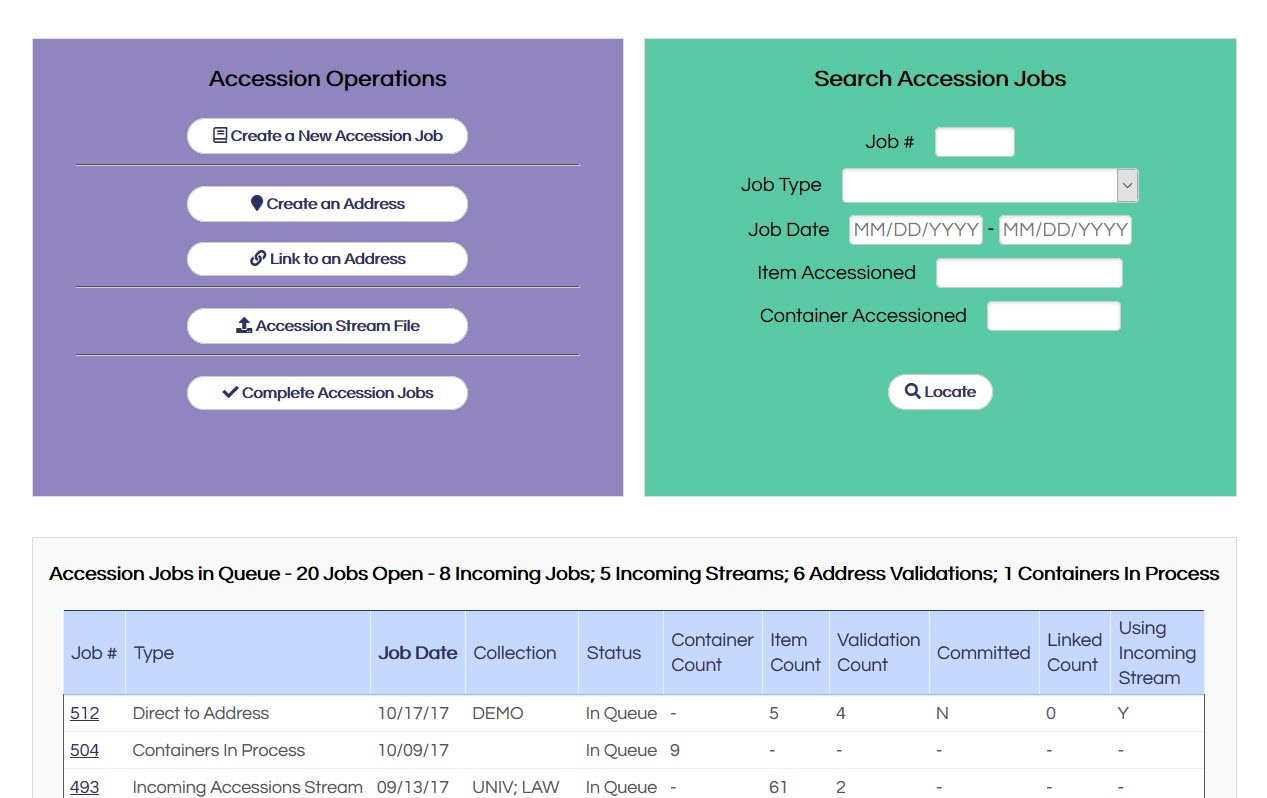 The Jobs In Queue table can be placed at the top or bottom of each module display. When the jobs table runs long, placing it at the bottom can save scrolling to the action buttons in the module. Toggle this feature in the System & Module Settings section of Administration. Each of the three modules with Jobs In Queue tables (Accession, Circulation, Inventory Management) are set to top or bottom individually.
