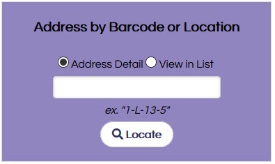 In addition to scanning a barcode into the Address Search field, the location may also be entered. Type the Aisle, Side, Ladder and Step assignments separated by a dash (-). The search will display the address with this location.