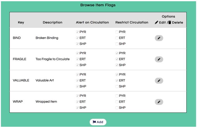 Flags (formerly referred to as Item Properties) can be assigned to items to alert users of special handling descriptions and instructions. Examples of Item Flags are Broken Binding, Too Fragile to Circulate, Valuable Art, and Wrapped. On retrieval and refile, the Item Flag will alert user as the item is added, and will display on the job and associated pick lists or packing slips. An Item Flag can also be set to prevent items from circulating.