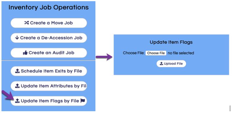 Item Flags can be assigned to Items individually in the Storage Management module, or be assigned in mass by file upload in the Inventory Management module.